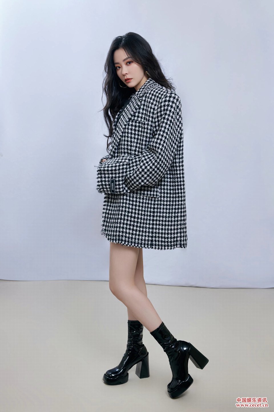 張靚穎身穿黑白方格西服大玩下衣失蹤美腿外露