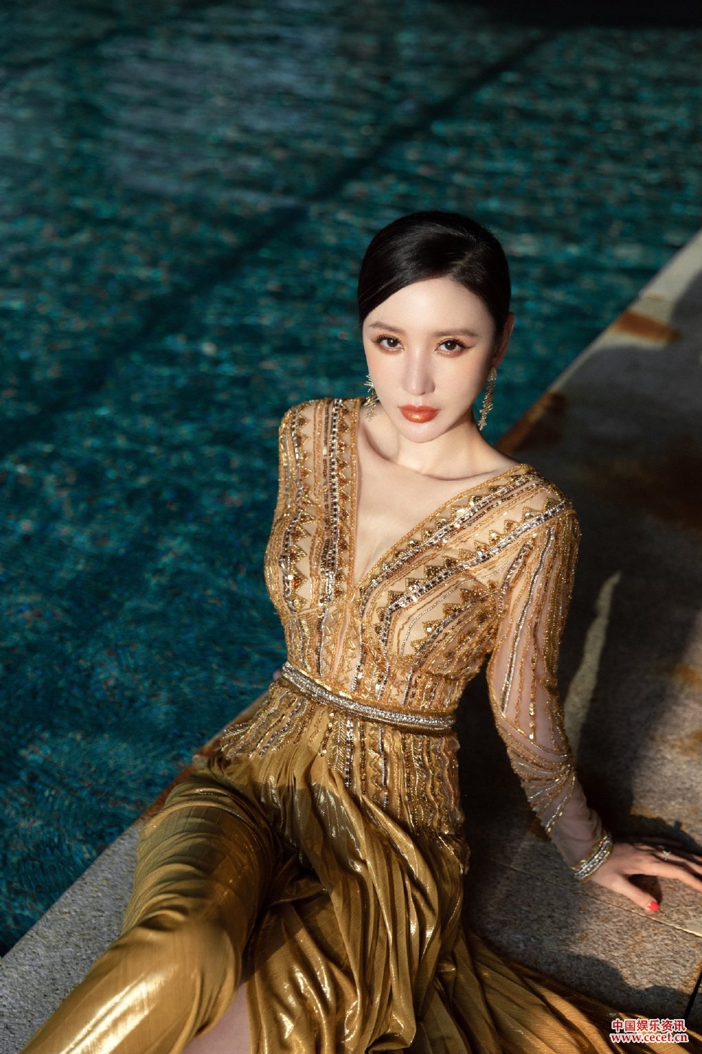 張萌身著(zhù)刺金流光溢彩裙光影間勾勒魅力線(xiàn)條