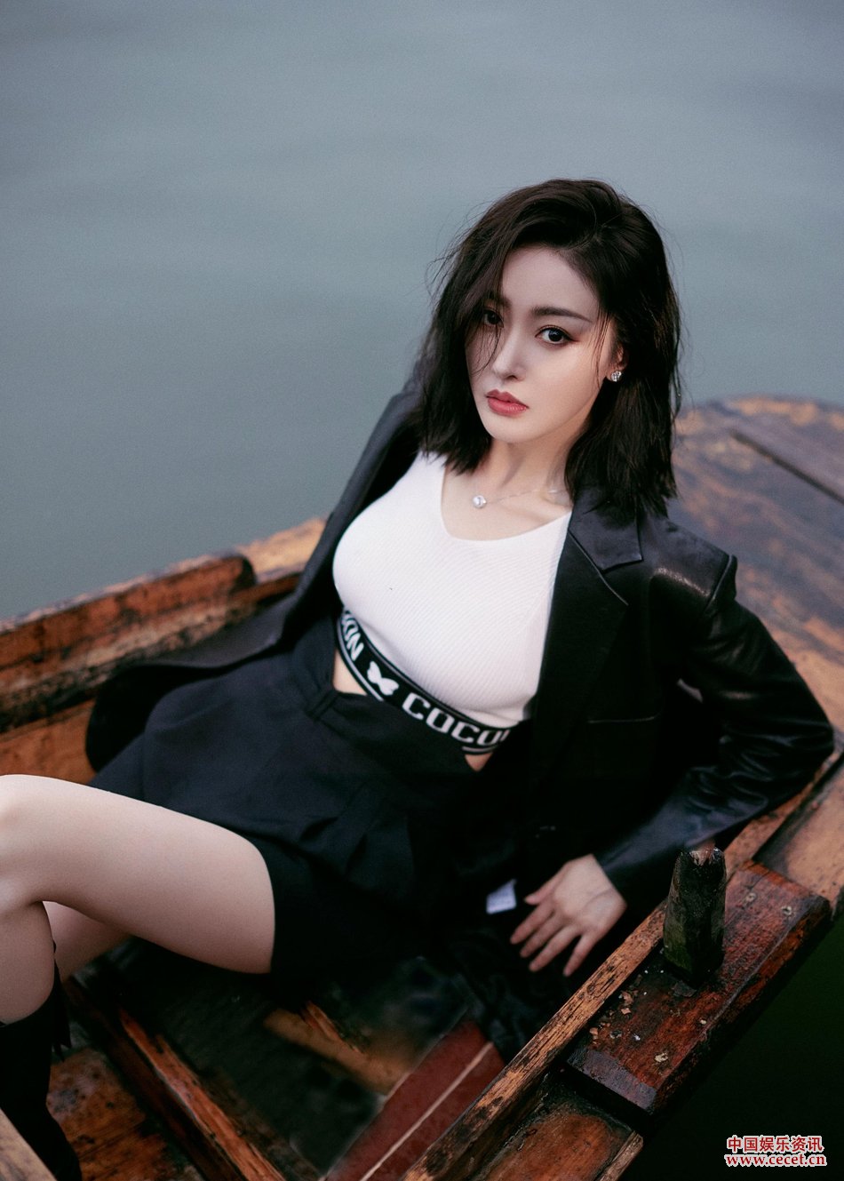 張天愛(ài)黑皮衣西湖大片 神色冷峻透出強大氣場(chǎng)