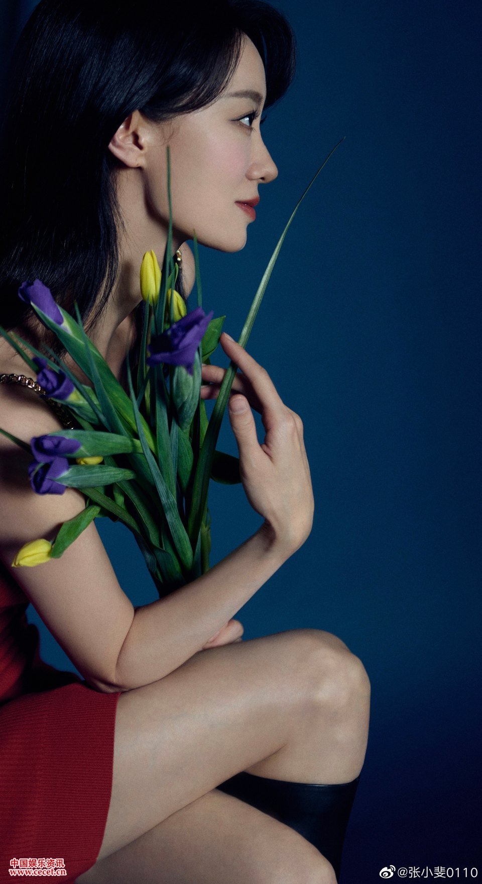 張小斐紅色吊帶短裙照 手捧鮮花含情默默