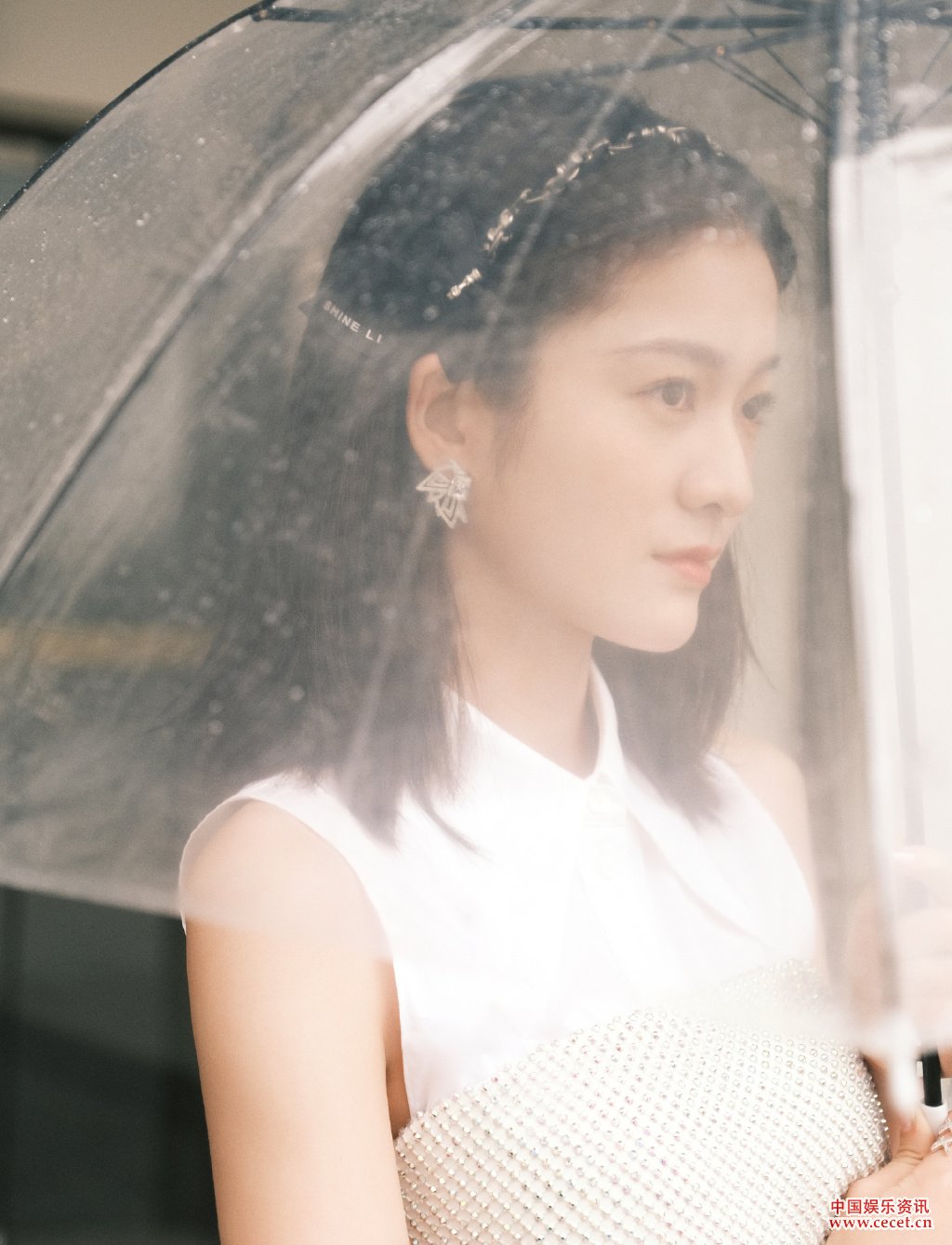 張雪迎白衣漫步綿雨中 柔婉浪漫赴青春之約