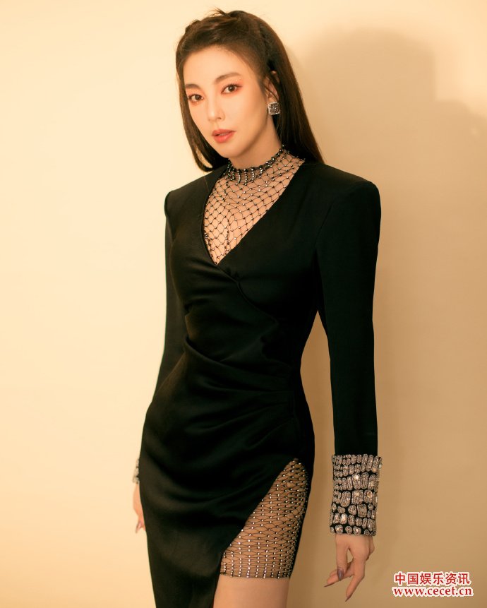 張雨綺黑色開(kāi)衩V領(lǐng)裙高貴星范 女人味十足