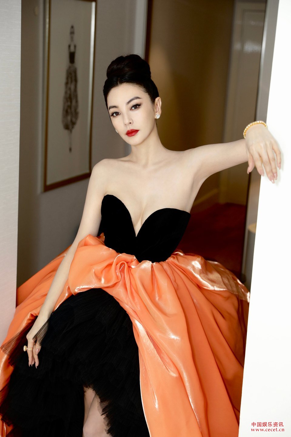 張雨綺身著(zhù)黑橘撞色拖尾長(cháng)裙大膽前衛 風(fēng)情萬(wàn)種