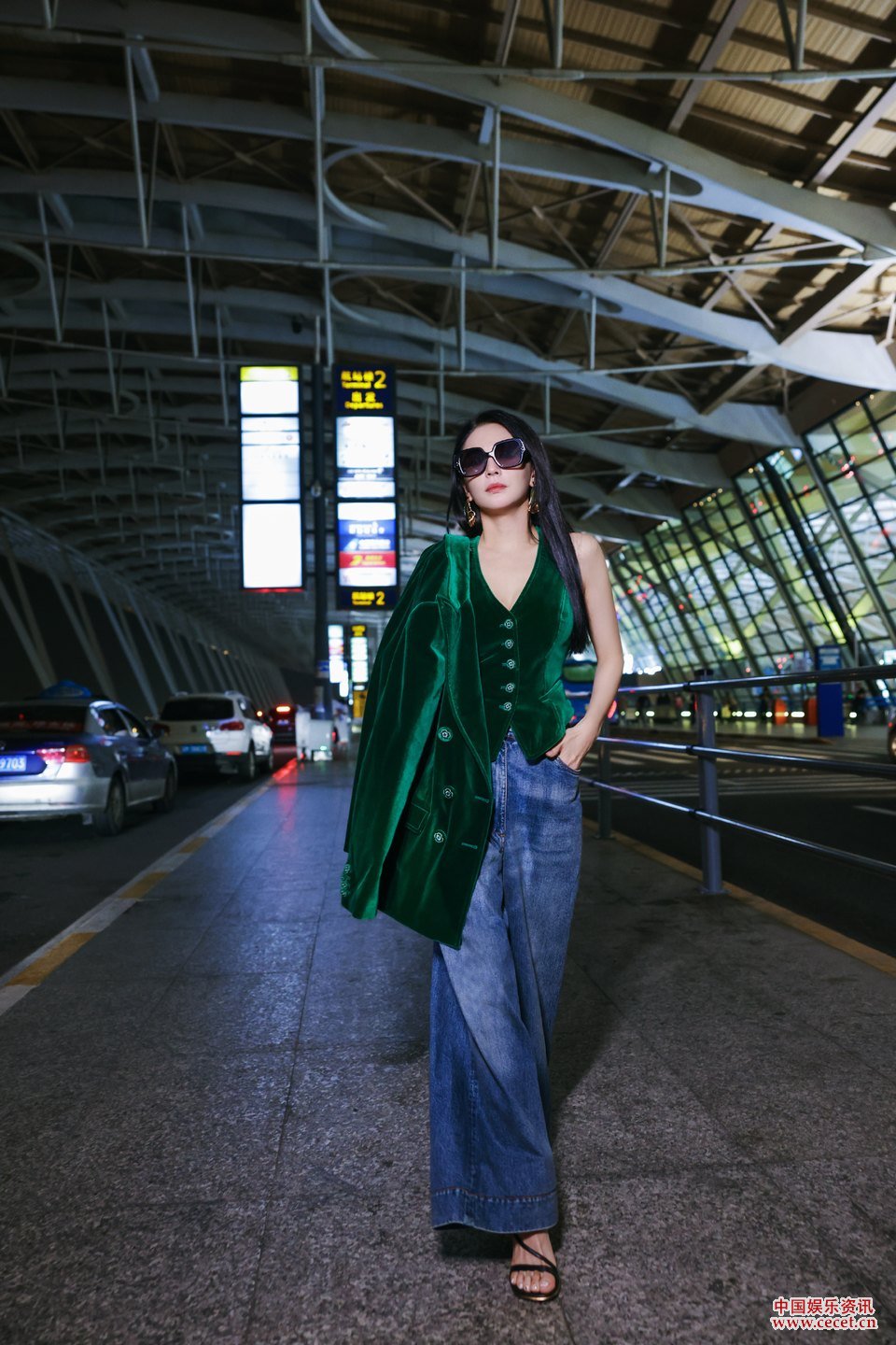 張雨綺綠絲絨西裝外套搭配闊腿牛仔褲混搭時(shí)尚風(fēng)格