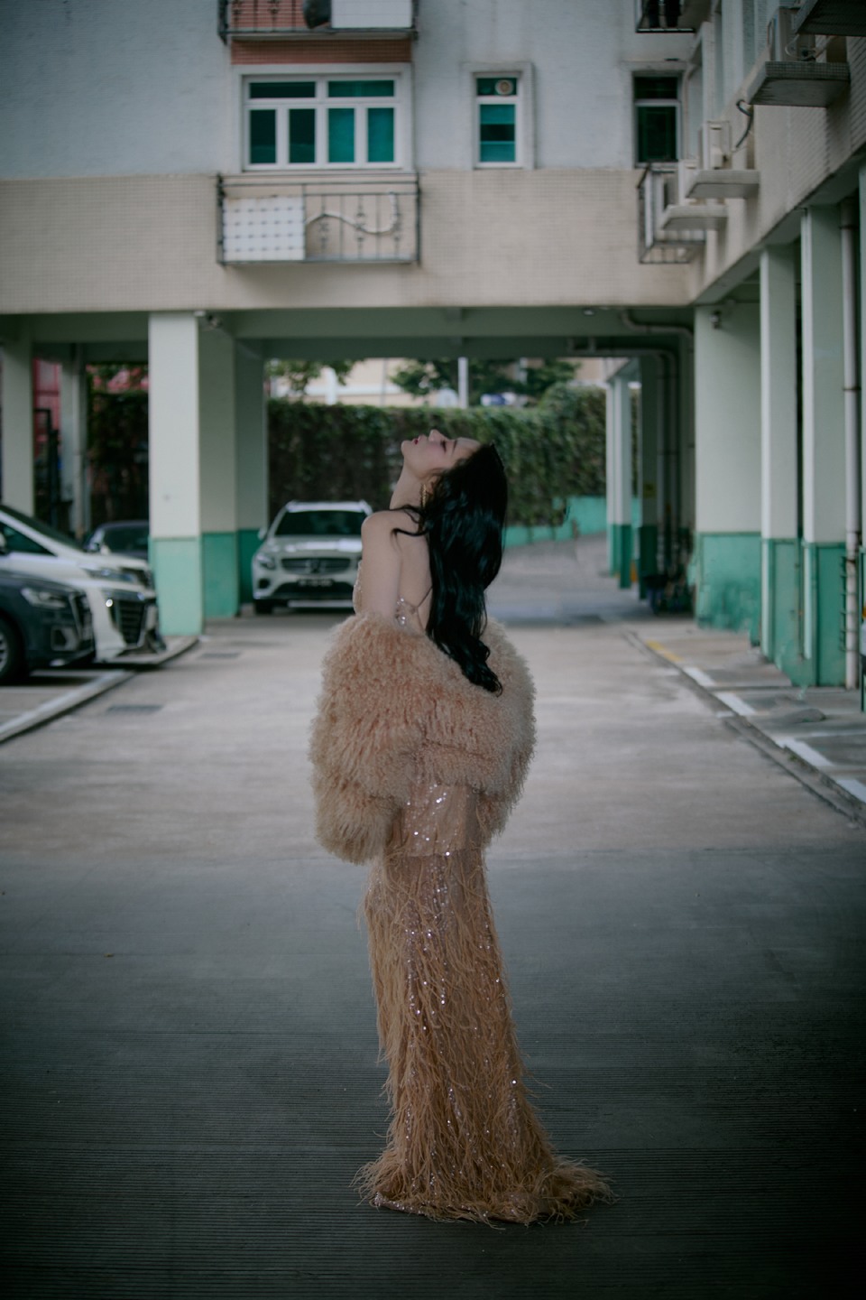 張紫寧香檳色吊帶長(cháng)裙 毛絨感凸顯柔婉與艷颯