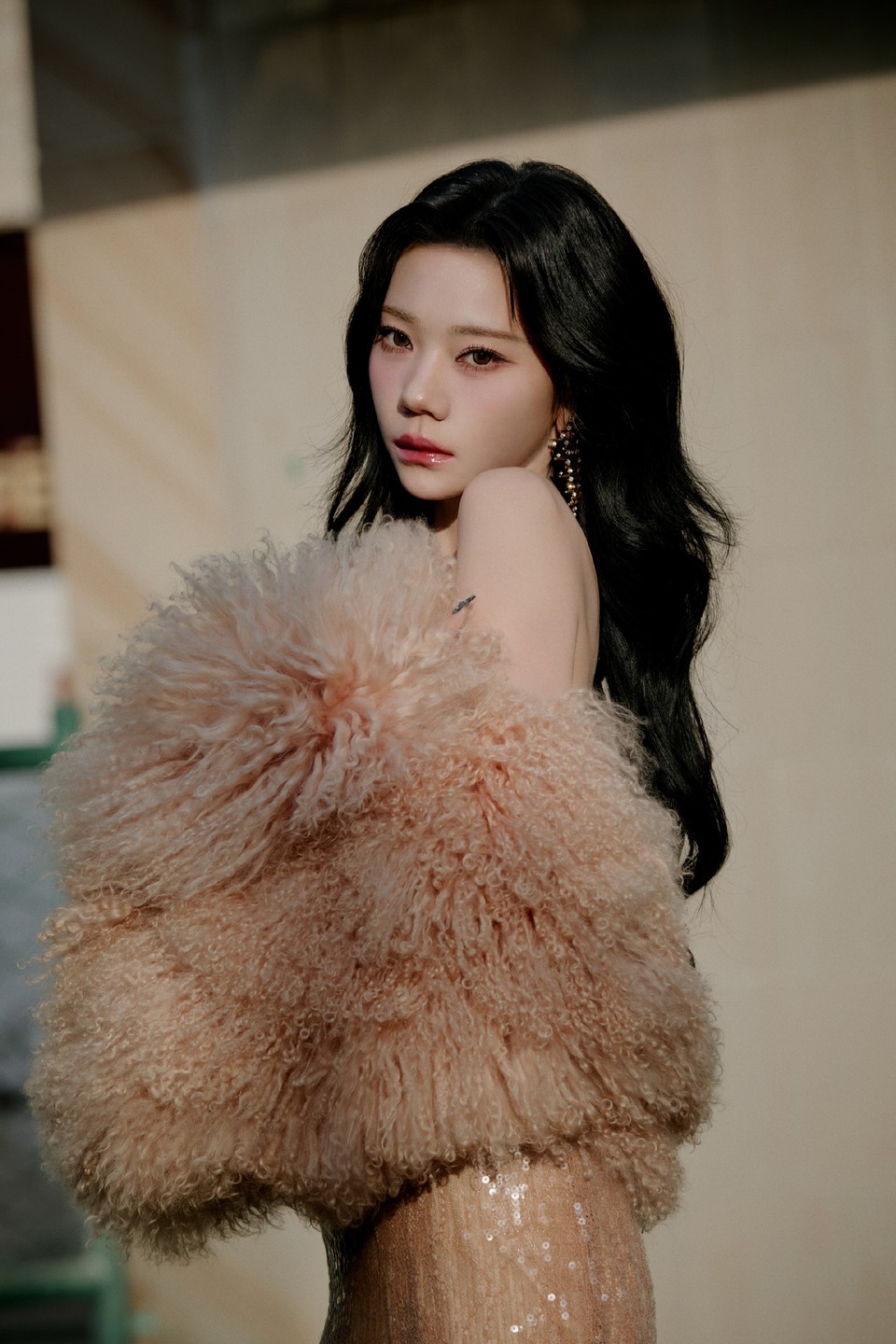 張紫寧香檳色吊帶長(cháng)裙 毛絨感凸顯柔婉與艷颯