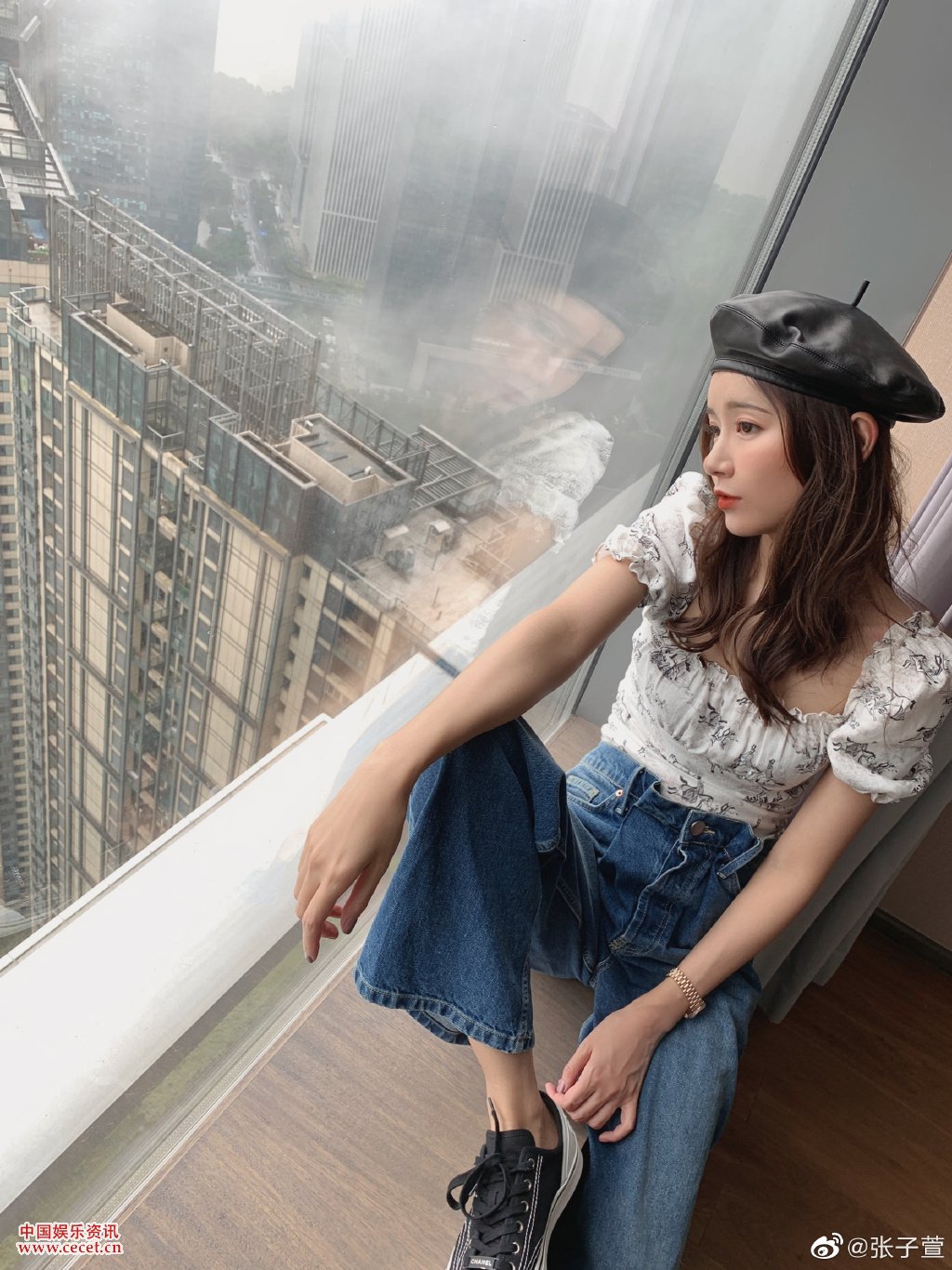 張子萱闊腳牛仔褲美圖 眼神憂(yōu)郁地望向窗外