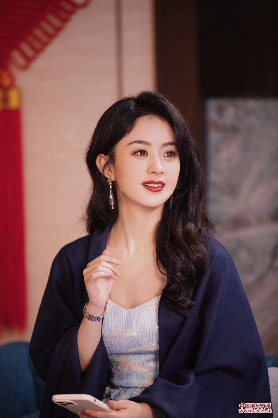 趙麗穎清新風(fēng)花絮照 藍色抹胸連衣裙溫柔可人