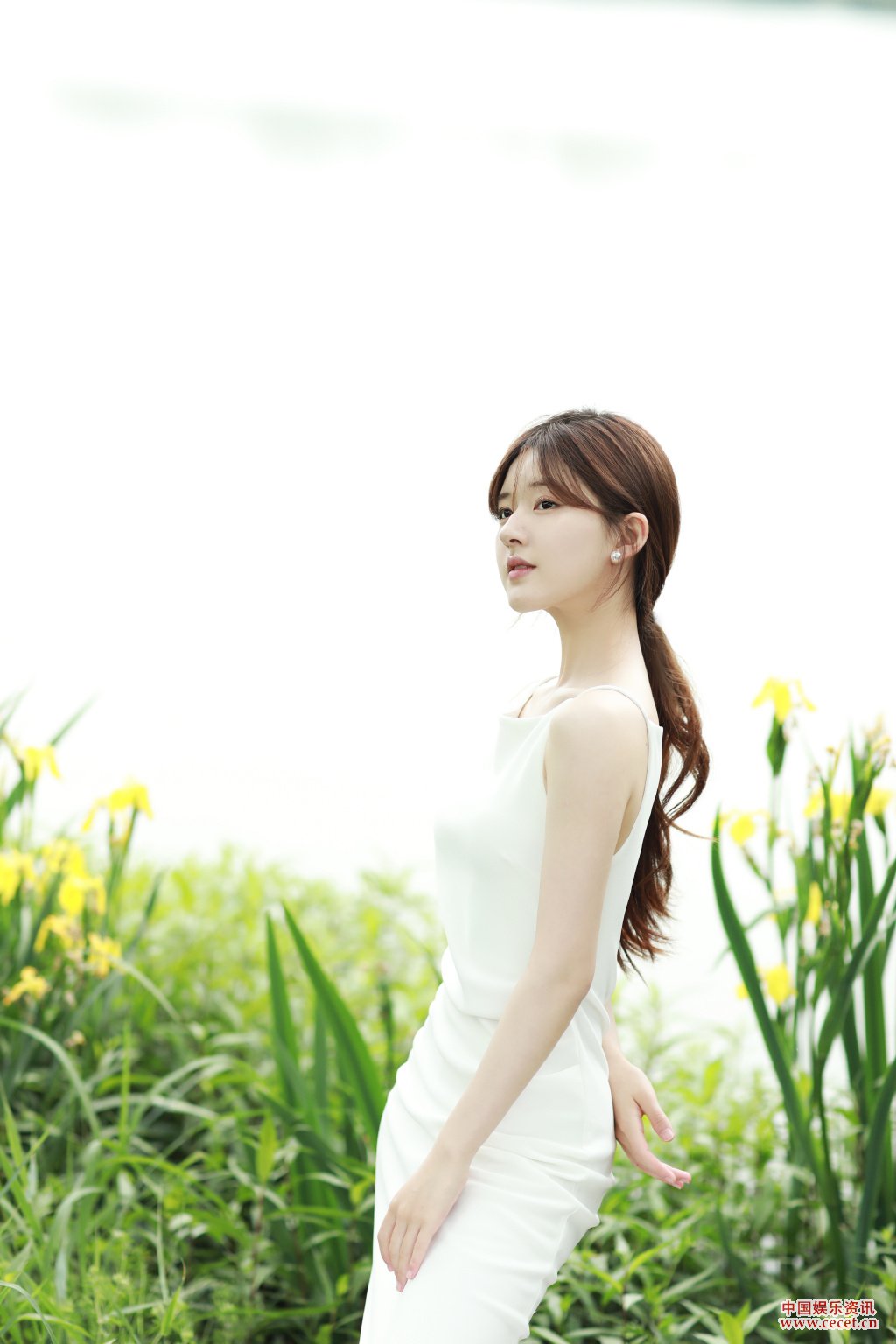趙露思白裙置身菏塘邊 梳著(zhù)馬尾辮清爽活力