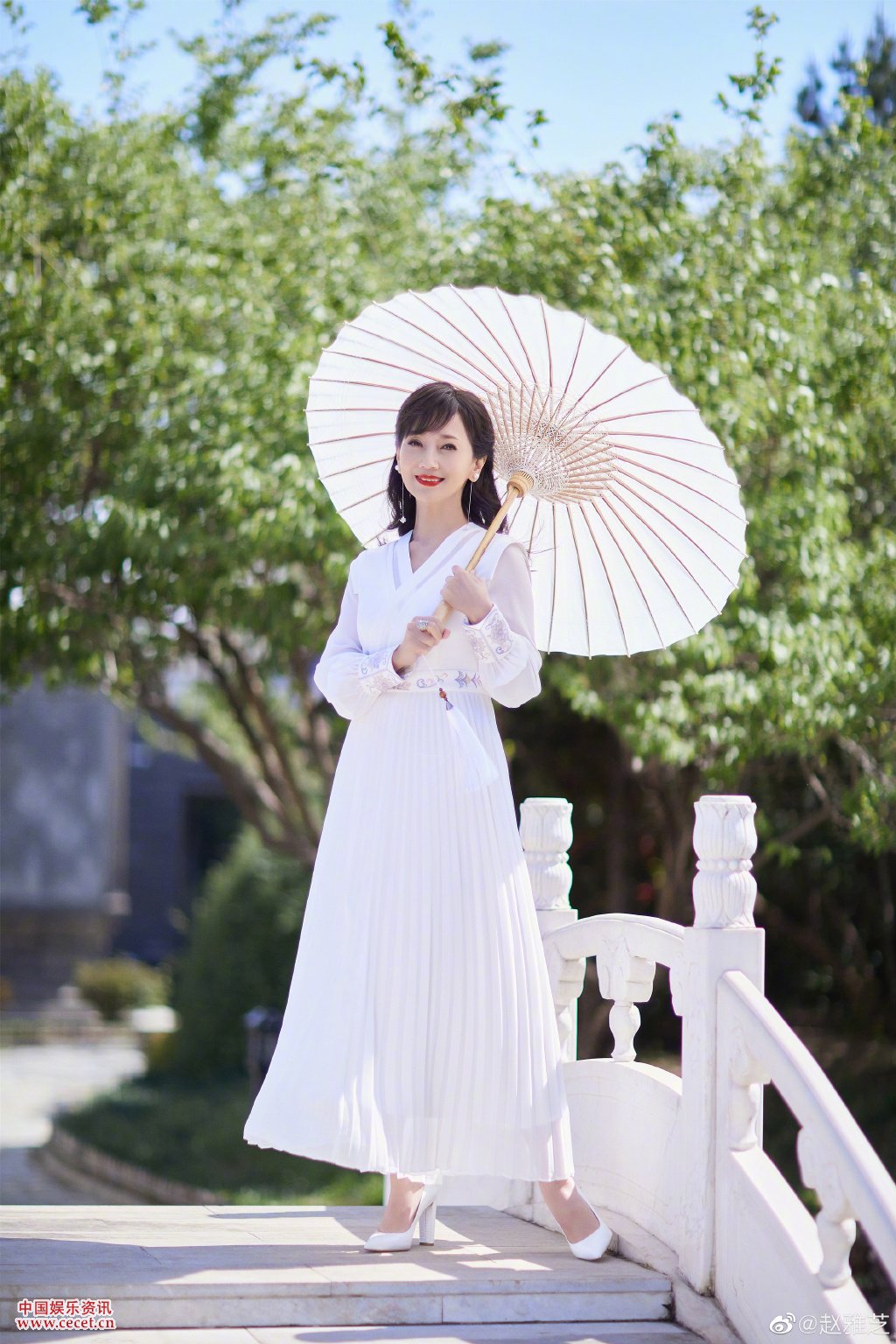 趙雅芝白裙橋邊漫步 煙雨朦朧仿佛夢(mèng)回西子湖畔