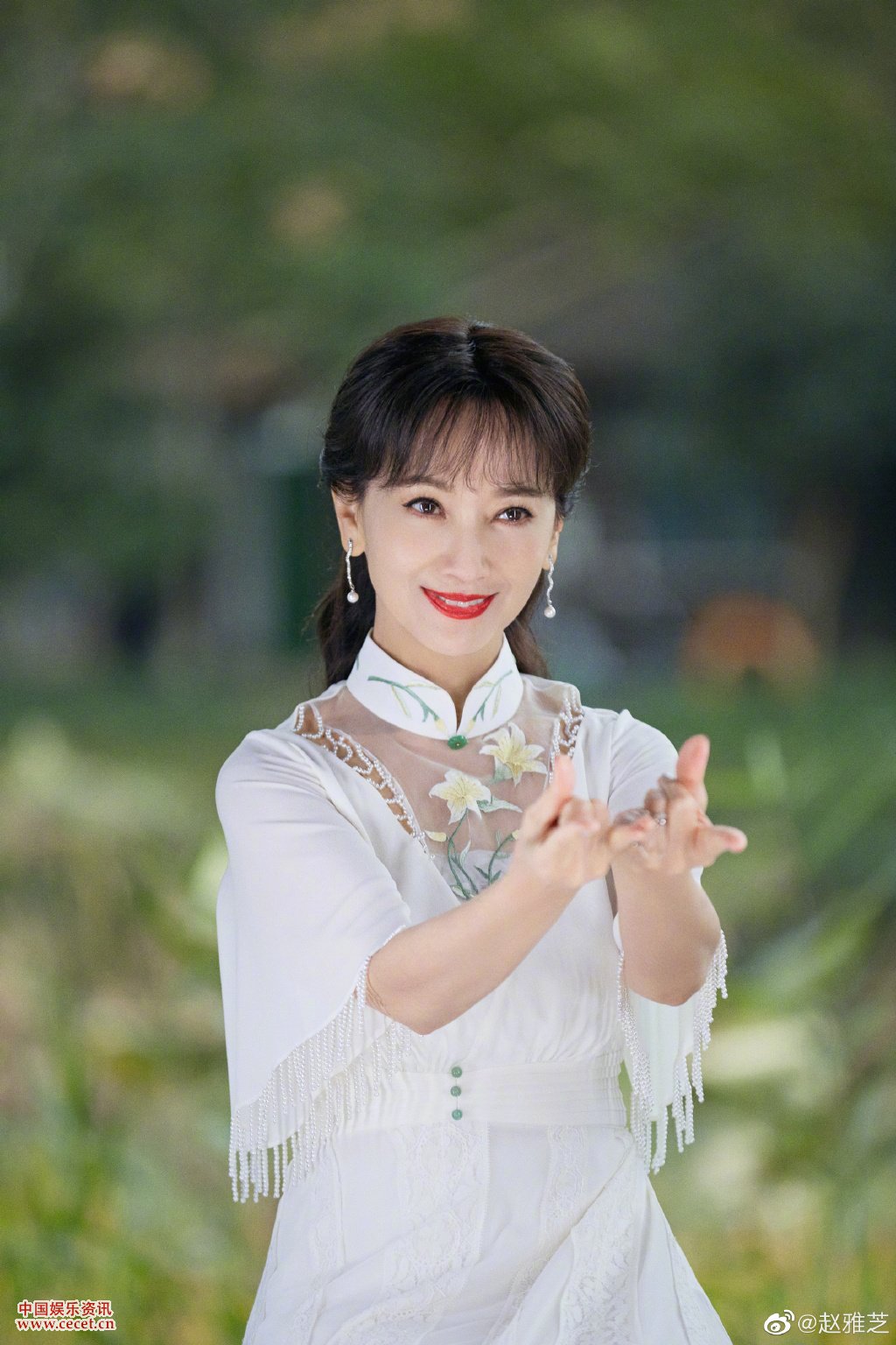 趙雅芝白裙置身綠林中 落葉滿(mǎn)地感受浪漫詩(shī)意