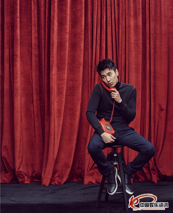 趙又廷休閑服飾逗趣與復古紅色幕布“互動(dòng)”