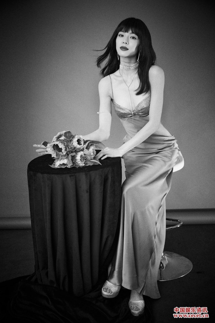 鐘楚曦穿著(zhù)低胸色緞面長(cháng)裙擺S造型秀婀娜身材