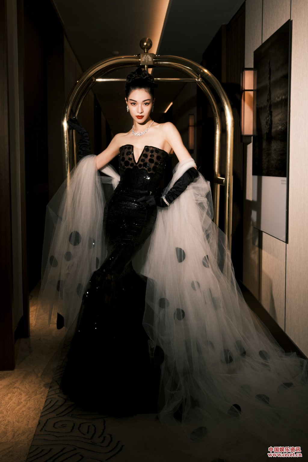 鐘楚曦波點(diǎn)魚(yú)尾裙氛圍照 黑白交織星光一色