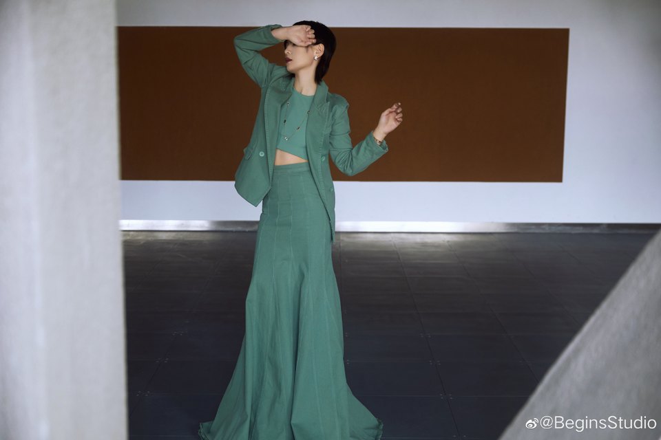 周筆暢裙袂曳地綠意飄然 光影婆娑捕捉美好瞬間