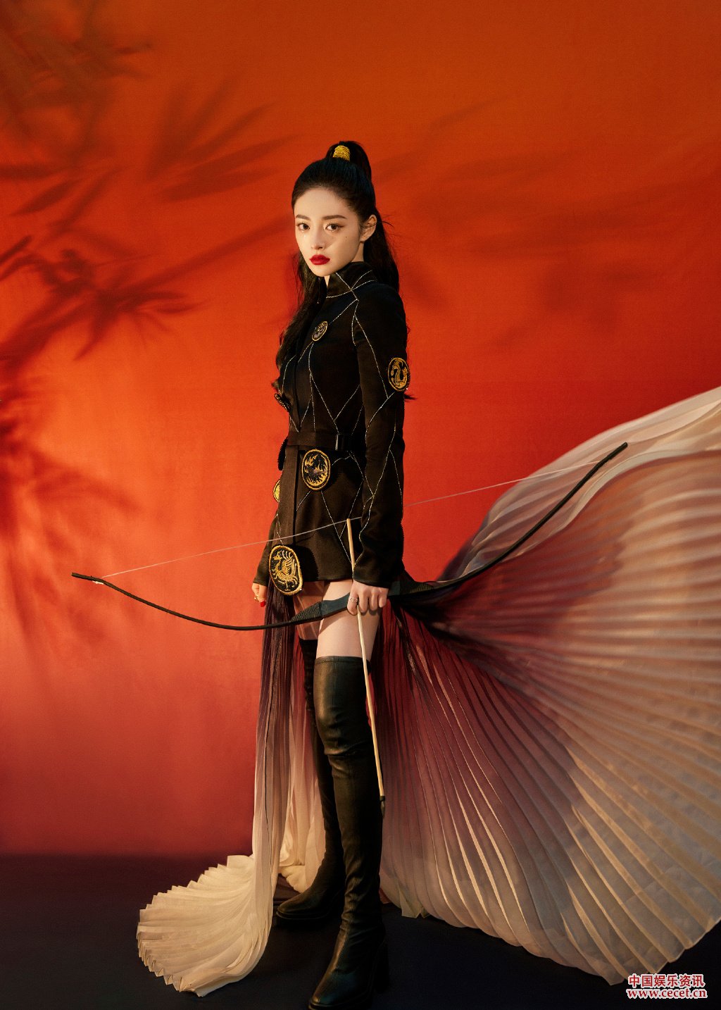 周潔瓊金絲水墨裙手持弓箭于紅墻之前一觸即發(fā)