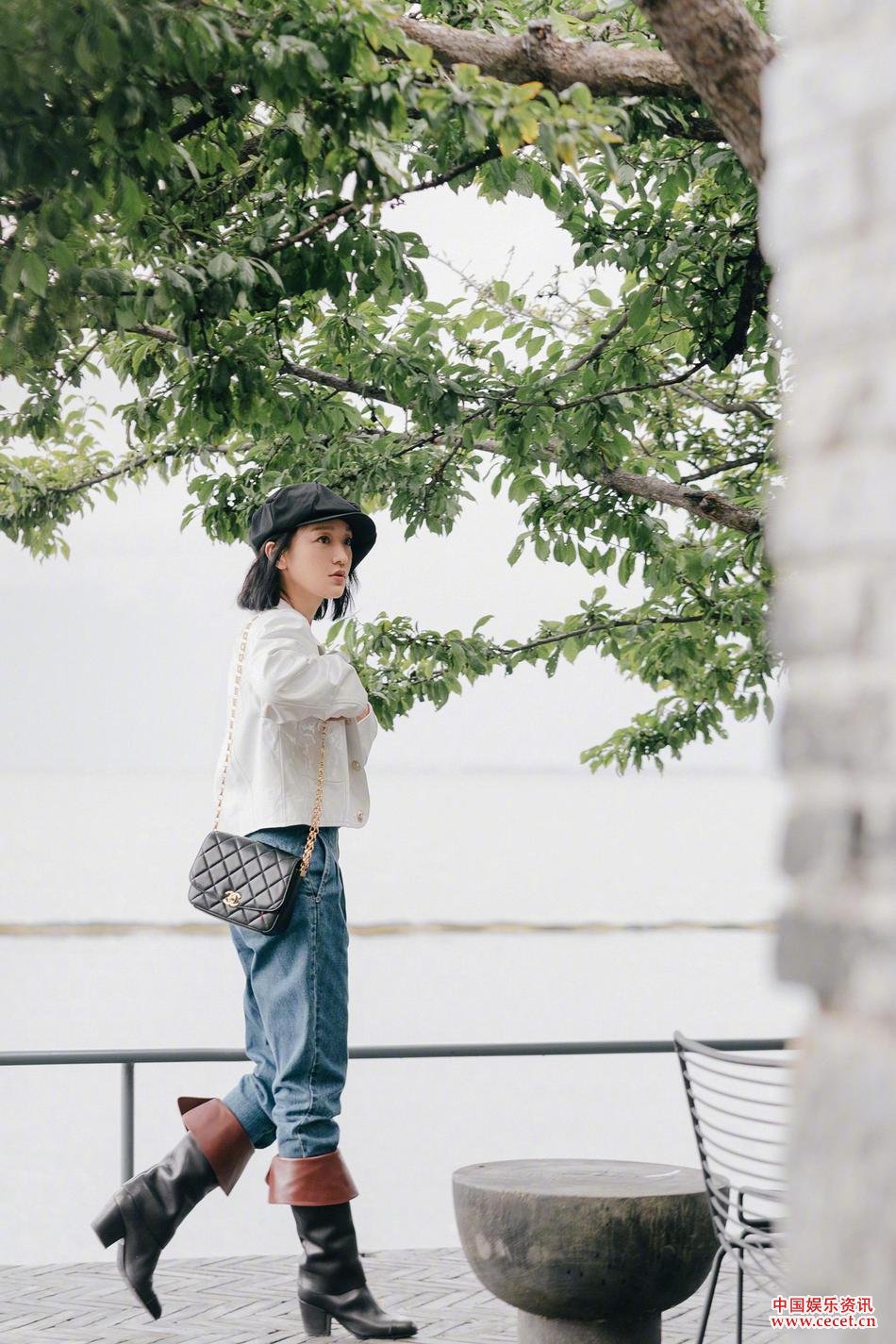 周迅出游美圖 頭戴小皮帽湖邊散步笑容靈動(dòng)