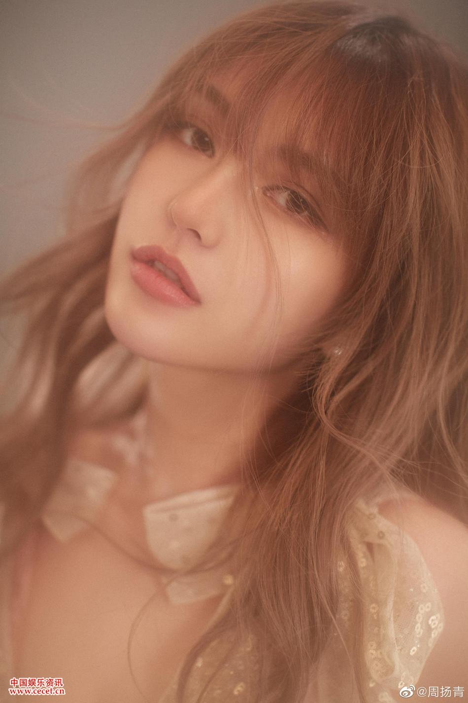 周揚身穿青香檳色亮片紗裙 披著(zhù)微卷長(cháng)發(fā)甜笑