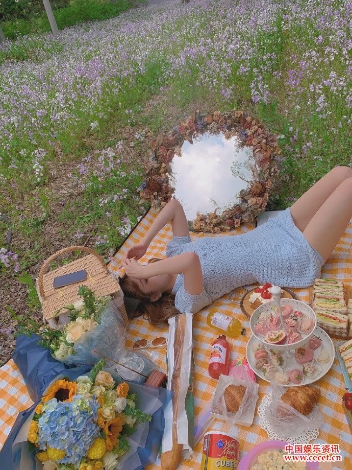 周揚青身穿藍色公主風(fēng)針織裙享受外出時(shí)光