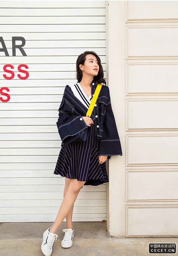 朱丹時(shí)尚大片酷感十足 豎紋V領(lǐng)連衣裙俏皮活潑